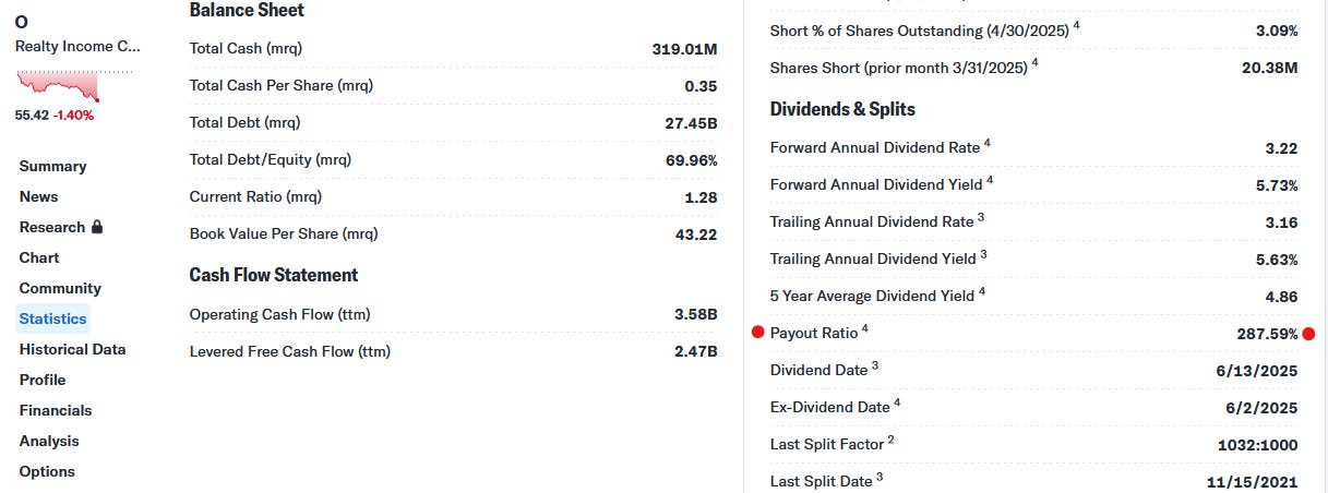 According to Yahoo Finance, Realty Income shows a payout ratio of 287%. That figure is clearly misleading. It suggests the company is paying out more than twice what it earns, which would raise serious questions about dividend sustainability.