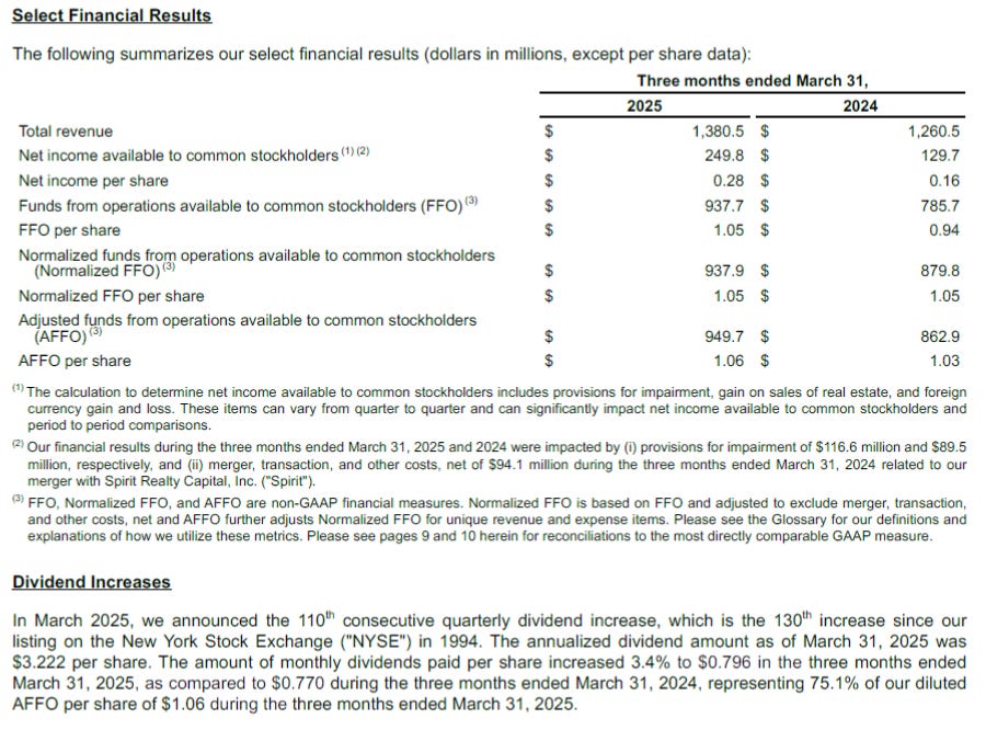 In its most recent quarterly earnings for the three months ended March 31, 2025, Realty Income reported AFFO per share of $1.06. During that same period, the company paid $0.796 in monthly dividends per share. That equates to a payout ratio of 75.1% of AFFO.